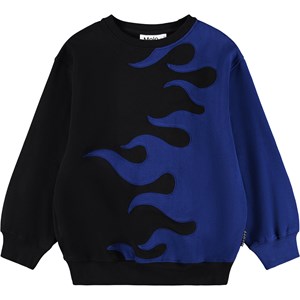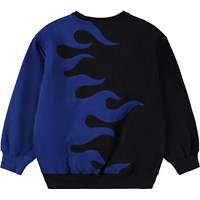 Schwarzer und blauer Sweatshirt aus weicher Öko-Baumwolle mit einem Flammenmotiv. Der Sweatshirt hat gerippte Abschlüsse am Hals, an den Ärmeln und am Saum. Der Sweatshirt hat eine lockere Passform.