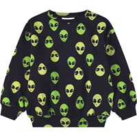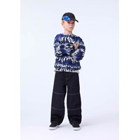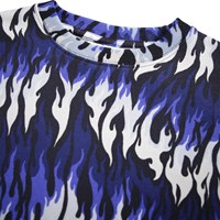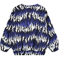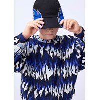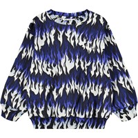 Blauer, weißer und schwarzer Sweatshirt aus weicher Öko-Baumwolle mit Flammenmuster. Der Pullover hat gerippte Kanten am Hals, an den Ärmeln und am Saum. Der Pullover hat eine lockere Passform.