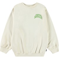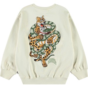 Off-weißes Sweatshirt aus weicher Öko-Baumwolle mit gerippten Kanten am Hals, an den Ärmeln und am unteren Saum des Sweatshirts. Das Sweatshirt hat eine lockere Passform mit einem farbenfrohen Druck eines Geparden, der von einer Schlange umwickelt ist, und dem Text 'Forza Della Natura' auf der Brust.