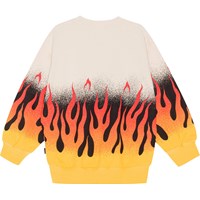 Beiges Öko-Sweatshirt mit orangefarbenem Flammendruck. Der Druck ist ein grafisches Flammenmotiv in einer abgestuften Farbskala von Rot über Orange bis Gelb. Die Flammen sind unten an den Ärmeln und am Körper platziert, sodass der Eindruck entsteht, dass die Flammen das Hemd hinauflecken. Der Pullover hat eine lockere Passform, einen Rundhalsausschnitt mit Rippbündchen und Rippbündchen an Handgelenken und Hüften.