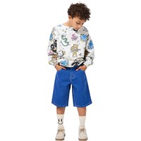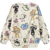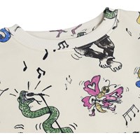 Beiges Sweatshirt aus weicher, ökologischer Baumwolle mit gerippten Kanten am Hals, an den Ärmeln und am Saum. Das Sweatshirt hat eine lockere und entspannte Passform mit einem lebhaften Druck von singenden Tieren.