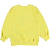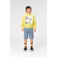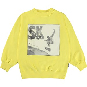 Monti ist ein gelbes Sweatshirt mit dem Aufdruck "SK8" in Schwarz-Weiß auf der Vorderseite. Monti hat Ripp am Hals, Handgelenk und Hüfte.