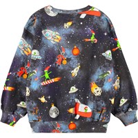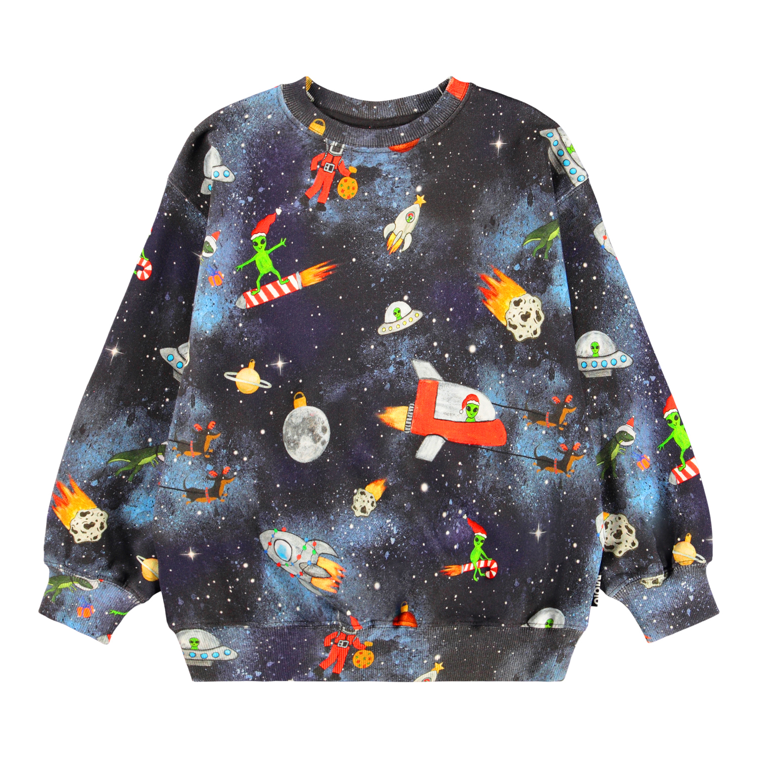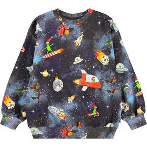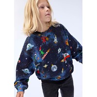 Blauer Pullover aus weicher Öko-Baumwolle mit einem Aufdruck von ''Christmas im Weltraum''. Der Pullover hat gerippte Kanten am Hals, an den Ärmeln und am Saum. Der Pullover hat eine lockere Passform.