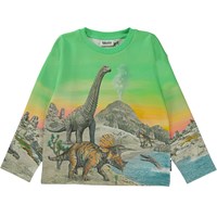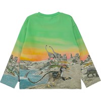 Mountoo ist ein grünes Sweatshirt mit einem Aufdruck verschiedener Dinosaurier, die sowohl an Land als auch im Wasser leben. Hinter den Dinosauriern ist ein Vulkanausbruch zu sehen. Der Druck auf dem Sweatshirt ist durchgehend und setzt sich auf beiden Ärmeln fort, vorne und hinten, was einen 3D-Effekt ergibt.