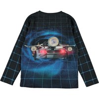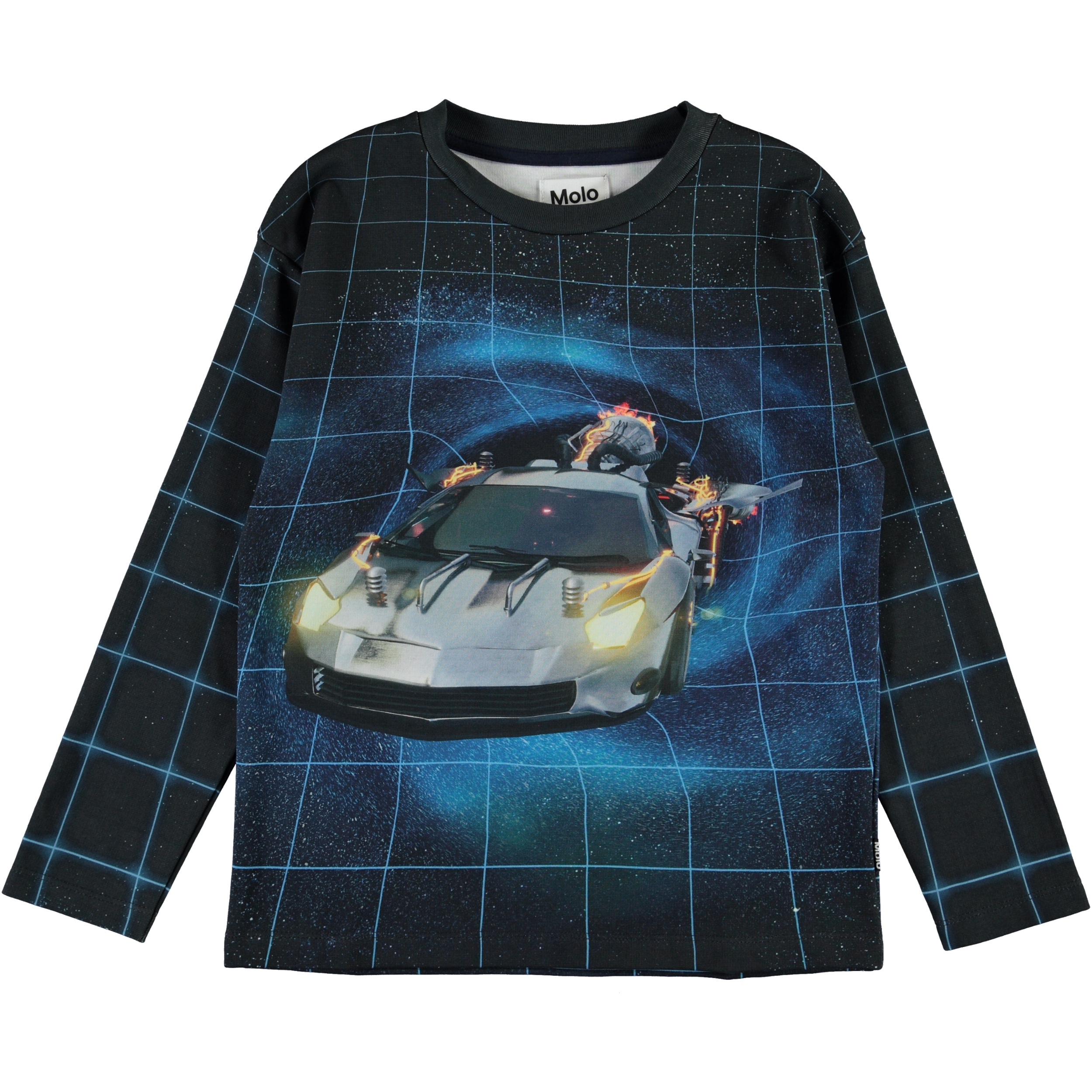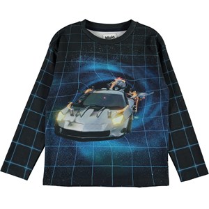 Mountoo ist eine Bluse mit dem Druck eines Autos, das auf der Vorderseite der Bluse durch die Zeit reist. Der Druck setzt sich sowohl auf dem Rücken als auch auf den Ärmeln fort und vermittelt ein schönes 3D-Gefühl.