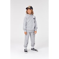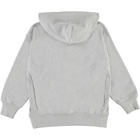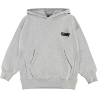 Moz ist ein hellgrau melierter Sweatshirt-Hoodie mit Taschen am Bauch und schwarzem Logo-Patch auf der linken Seite. Moz hat Ripp an Handgelenk und Hüfte.