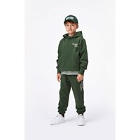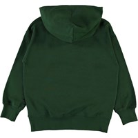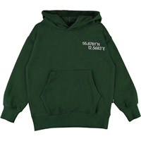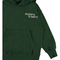 Moz ist eine grüner Hoodie mit Kängurutasche auf der Vorderseite und weissen aufgestickten Koordinaten auf der Brust die zeigen, wo Molo herkommt.  Ecocert Greenlife, certifikationsnr. 197496.
