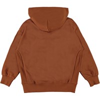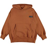 Moz ist ein brauner Hoodie mit einer Känguru-Tasche auf der Vorderseite und einem Molo-Logo auf der Brust.