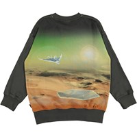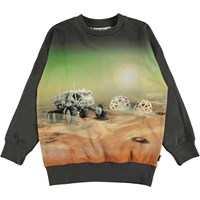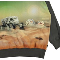 Mozy ist ein grünes Sweatshirt mit einem Aufdruck vom Mars auf der Vorderseite. Das Sweatshirt hat eine längere Passform.