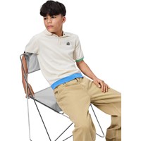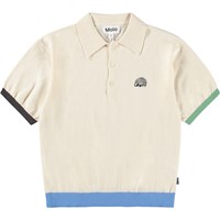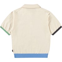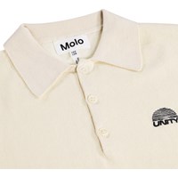 Poloshirt aus cremeweißem Strick aus weicher, ökologischer Baumwolle mit klassischem Kragen und Knopfverschluss vorne. Das Poloshirt hat eine normale Passform und ist mit farbigen gerippten Kanten an den Ärmeln und am Saum versehen, was einen sportlichen und zeitlosen Ausdruck verleiht. Der Text "Unity" ist als einfaches, grafisches Detail auf der Brust aufgedruckt.