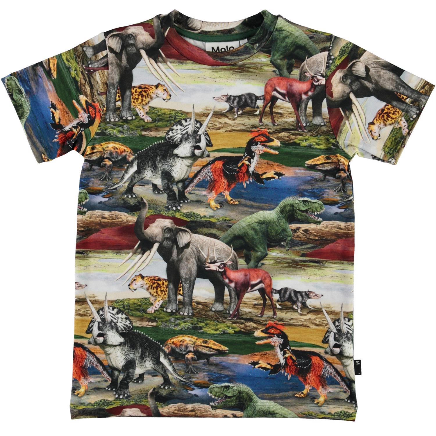 Raphie ist ein T-Shirt mit Aufdruck von der der Welt und Tieren der Vergangenheit in schönen, grünen und roten Farben. Ecocert Greenlife, certifikationsnr. 197496.