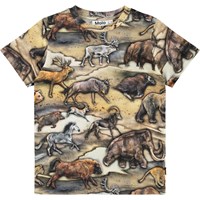 Eng anliegendes T-Shirt aus weicher Öko-Baumwolle mit geripptem Ausschnitt. Das T-Shirt hat ein durchgehendes braunes Katzenmuster.