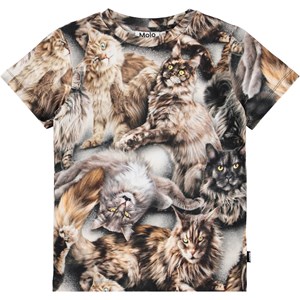 Eng anliegendes T-Shirt aus weicher Öko-Baumwolle mit geripptem Ausschnitt. Das T-Shirt hat ein durchgehendes braunes Katzenmuster.