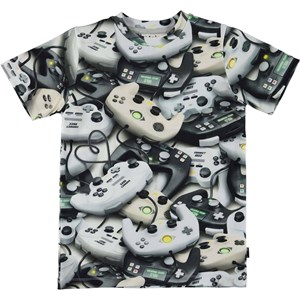 Raphie ist ein T-Shirt mit Aufdrucken von Gaming-Controllern.
