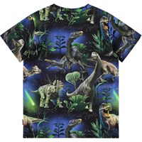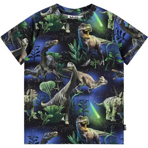 Blau-grünes T-Shirt aus weicher Öko-Baumwolle mit geripptem Ausschnitt. Das T-Shirt ist figurbetont geschnitten und hat einen Aufdruck von Dinosauriern unter einem wunderschönen Sternenhimmel.