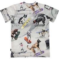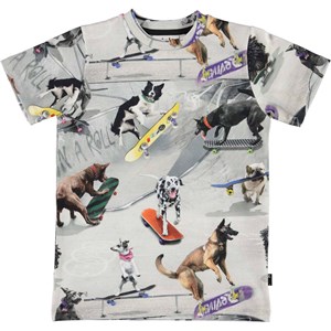 Raphie ist ein T-Shirt mit einem Aufdruck von Hunden auf einem Skateboard.