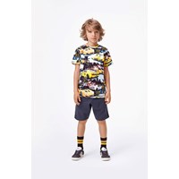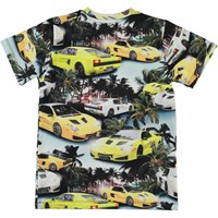 Raphie ist ein T-Shirt mit Druck von schnellen Autos und Palmen auf einem hellblauen Hintergrund.  Ecocert Greenlife, certifikationsnr. 197496.
