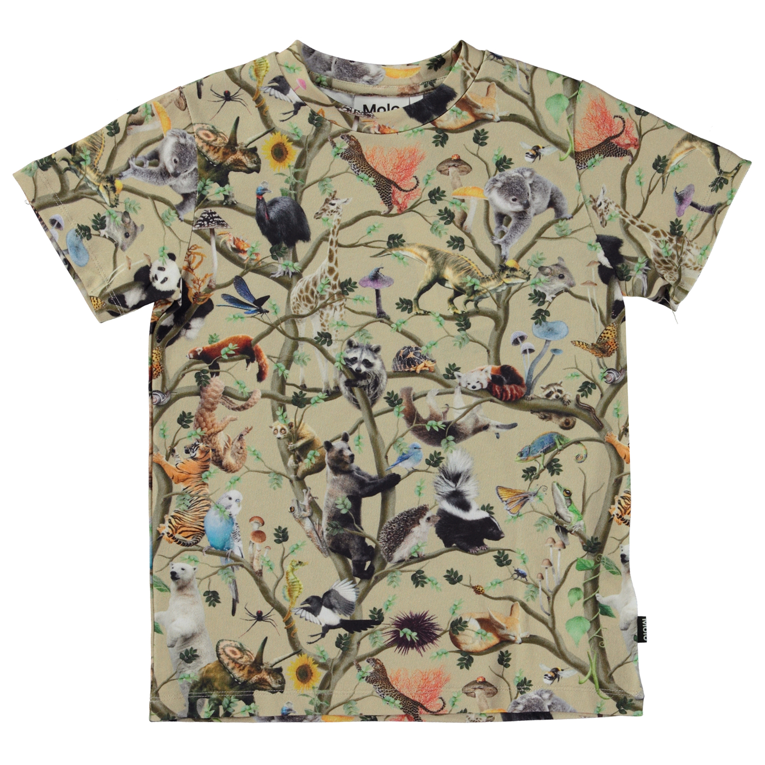 Beiges T-Shirt mit Allover-Print. Der Druck zeigt alle Arten von Tieren im Baum des Lebens. Sie erzählen die Geschichte, wie wir alle auf der Welt meiterander verbunden sind. Wie die Wurzeln von Bäumen sind Pilze und Vögel, Bäume und Bären, groß und klein, miteinander verbunden sind, und dass wir uns alle umeinander kümmern mussen. Dieses T-Shirt besteht aus 100% Baumwolle, hat einen kurzen Armel, einen runden Halsausschnitt, einen gerippten Halsausschnitt und eine normale Passform.