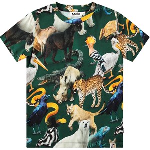 Mehrfarbiges T-Shirt aus Öko-Baumwolle mit kurzen Ärmeln und einem Rundhalsausschnitt mit geripptem Saum. Das T-Shirt hat eine normale Passform und einen Allover-Druck verschiedener Tiere auf einem grünen Hintergrund.