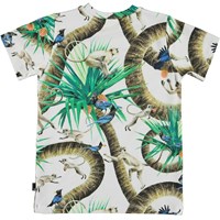 Raphie ist ein T-Shirt mit einem Aufdruck von Affen, die zwischen den Bäumen herumspringen.