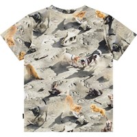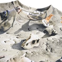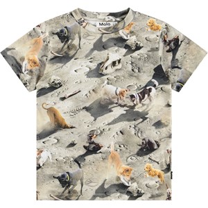 Graues T-Shirt aus weicher Öko-Baumwolle mit geripptem Ausschnitt. Das T-Shirt ist figurbetont geschnitten und hat einen Aufdruck von Hunden auf dem Mond.