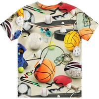 Mehrfarbiges T-Shirt aus Öko-Baumwolle mit kurzen Ärmeln, Rundhalsausschnitt und geripptem Saum. Das T-Shirt hat eine normale Passform und einen Allover-Print, inspiriert von der Idee der Olympischen Spiele als einem großen Spielplatz, auf dem du mit allen Sportarten experimentieren kannst, die du dir wünschst. Der Druck zeigt alle Sportgeräte, die du dir vorstellen kannst, und ermutigt dich, loszulegen und Spaß zu haben!