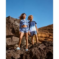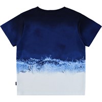 Blaues T-Shirt aus Bio-Baumwolle mit kurzen Ärmeln und geripptem Halsausschnitt. Das T-Shirt hat eine lockere Passform und einen Druck mit Wellen.