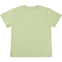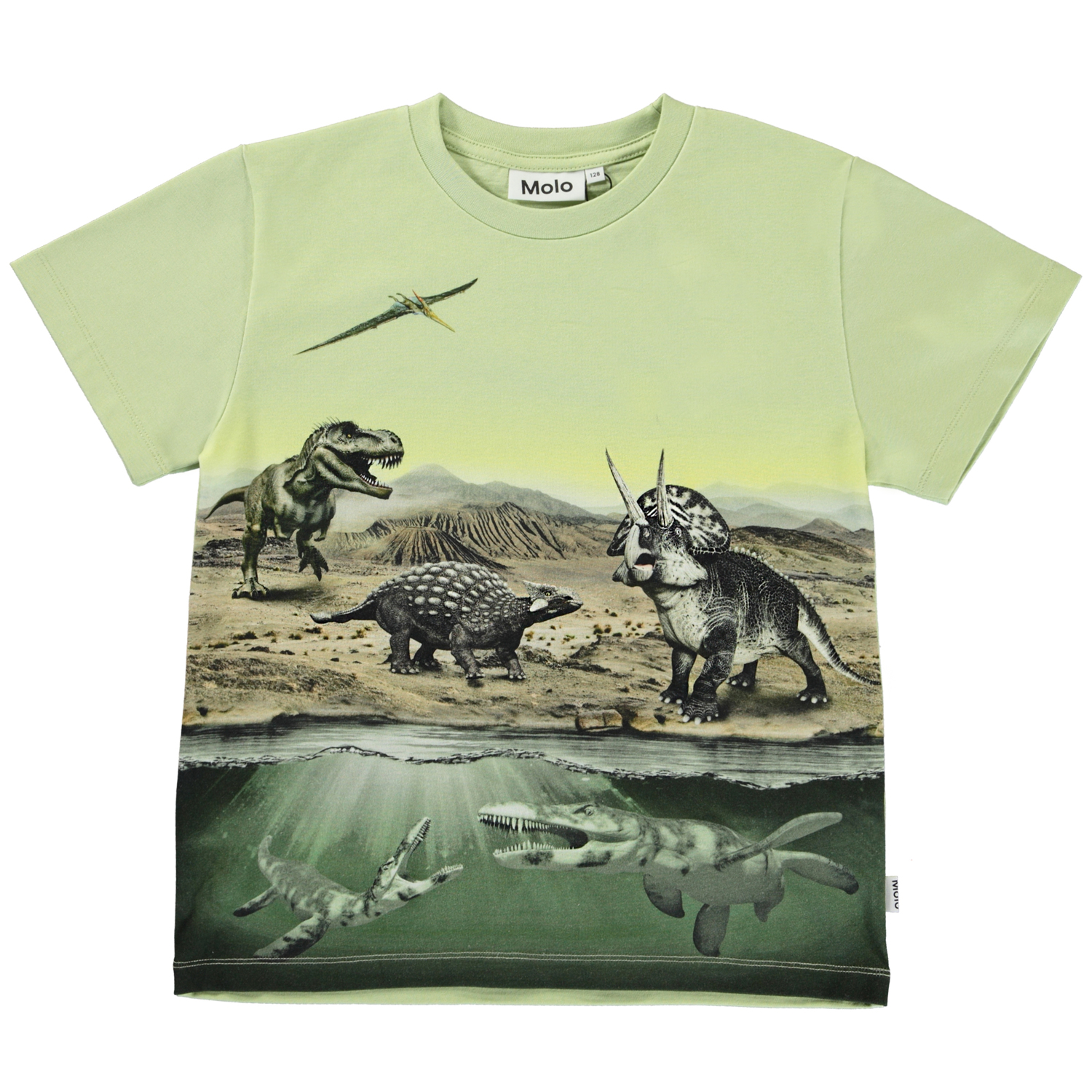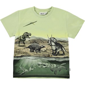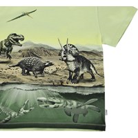 Rame ist ein grünes T-Shirt mit Dinosaurier-Print, auf dem sowohl Landdinosaurier als auch Dinosaurier, die im Wasser lebten, zu sehen sind.