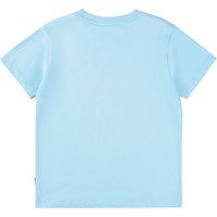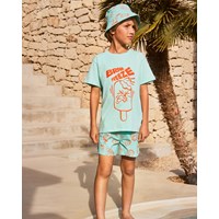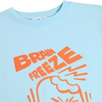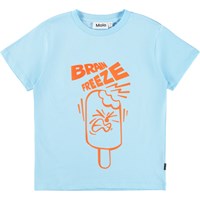 Blaues T-Shirt aus Bio-Baumwolle mit kurzen Ärmeln und geripptem Halsausschnitt. Das T-Shirt hat eine lockere Passform und einen orangefarbenen Druck mit Eiscreme und dem Text "Brain Freeze".