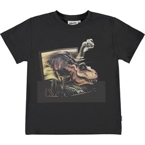 Rame ist ein schwarzes T-Shirt, in dem sich Vergangenheit und Zukunft treffen. Die Dinosaurier sind auf dem Weg aus dem Computerbildschirm, für Dich, der sitzt und spielt.