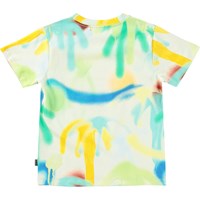 Weißes T-Shirt mit mehrfarbigem Allover-Print aus 100% Öko-Baumwolle. Der Druck besteht aus mit Graffiti bemalten Palmen und Herzen in Gelb, Grün und Blau. Das T-Shirt hat einen Rundhalsausschnitt mit geripptem Saum und eine normale Passform.