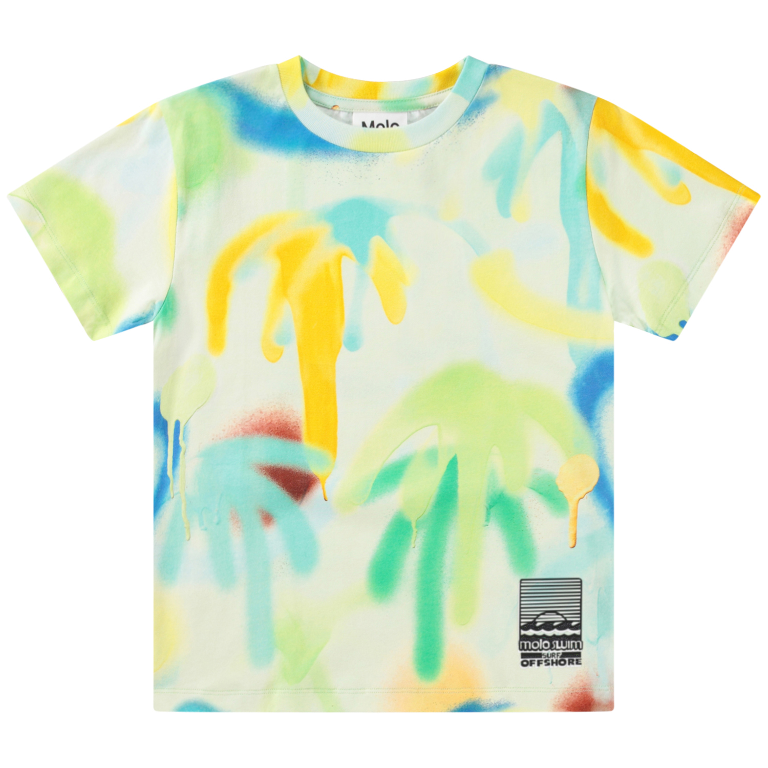 Weißes T-Shirt mit mehrfarbigem Allover-Print aus 100% Öko-Baumwolle. Der Druck besteht aus mit Graffiti bemalten Palmen und Herzen in Gelb, Grün und Blau. Das T-Shirt hat einen Rundhalsausschnitt mit geripptem Saum und eine normale Passform.