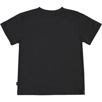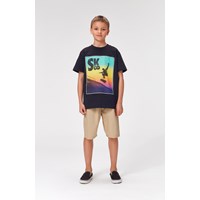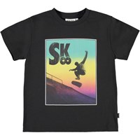 Rame ist ein schwarzes T-Shirt, auf dem ein Skater vor einem Regenbogen auf einem Skateboard fährt.