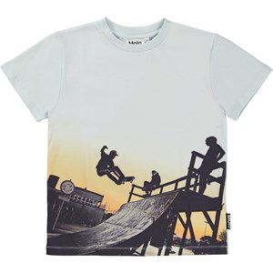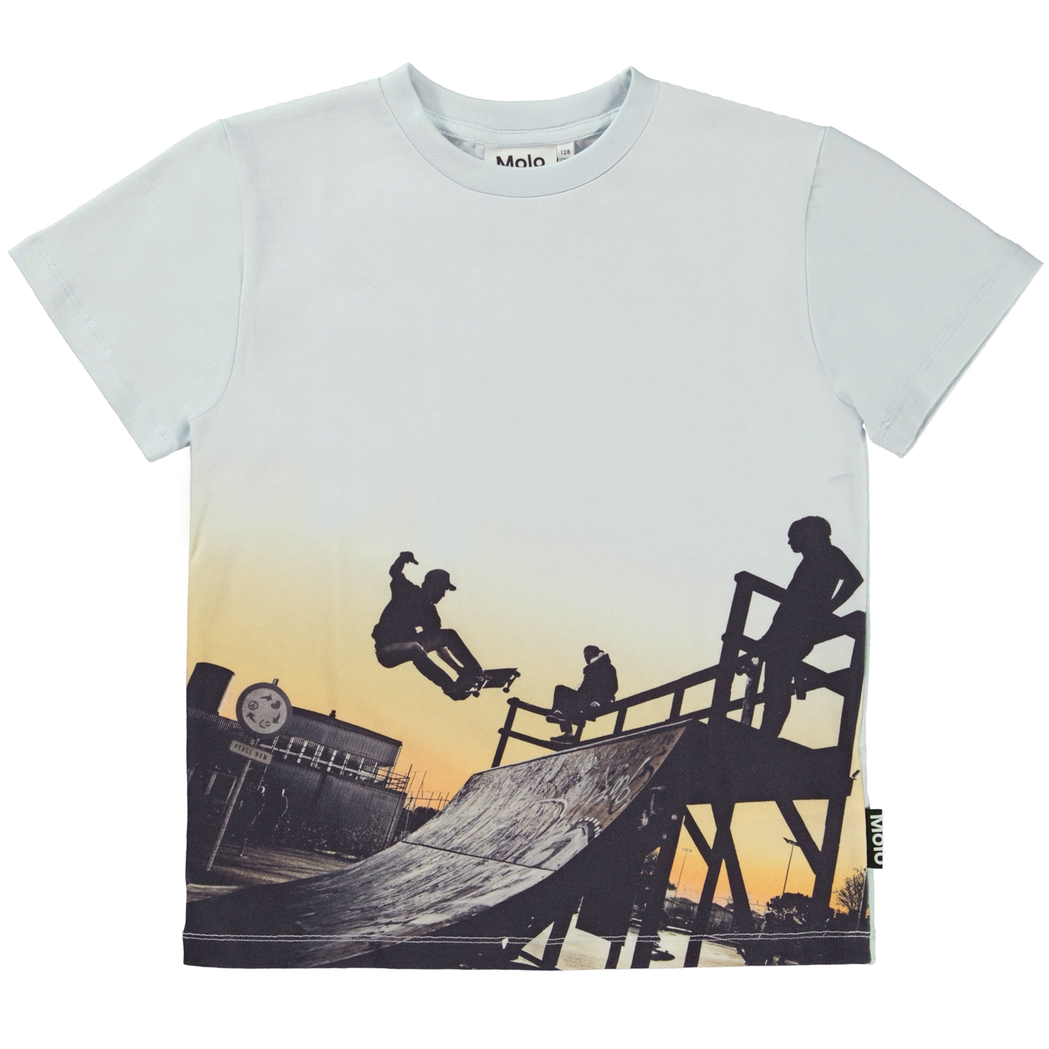 Rame ist ein hellblaues T-Shirt mit einem Aufdruck von Skatern auf der Rampe im Sonnenuntergang.