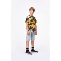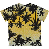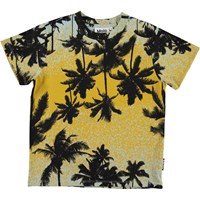 Rame ist ein T-Shirt mit Druck von Palmen in Gelb und Blau. Ecocert Greenlife, certifikationsnr. 197496.