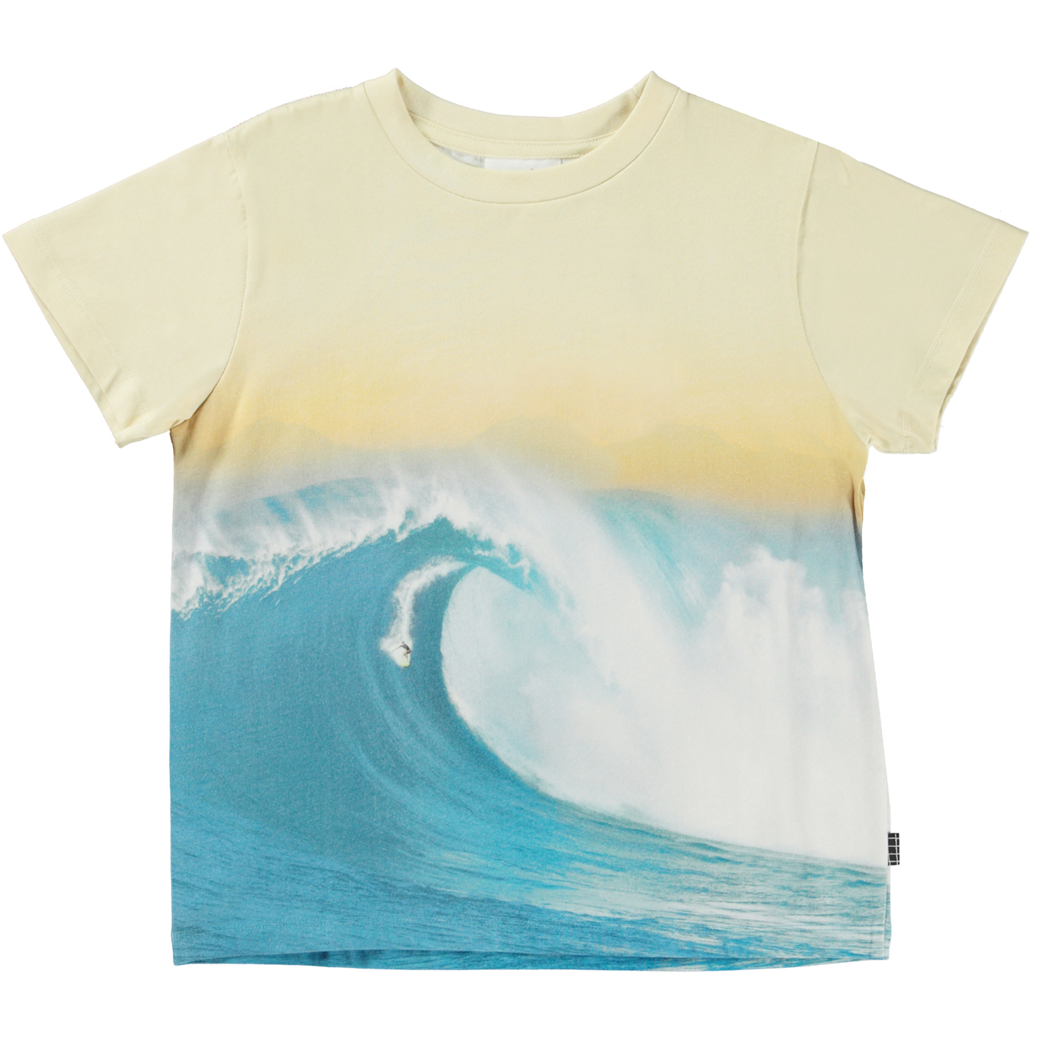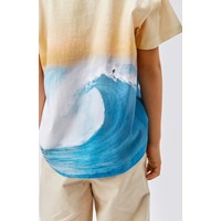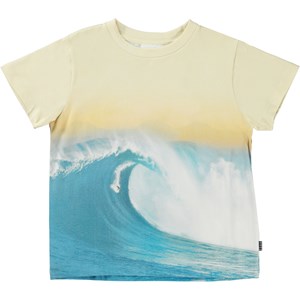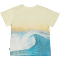 Rame ist ein T-Shirt aus Öko-Baumwolle mit Placement-Druck auf Vorder- und Rückseite. Der Aufdruck Surf Wave zeigt eine riesige blaue Welle unter einem klaren Himmel.