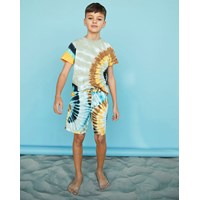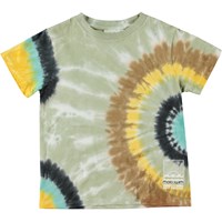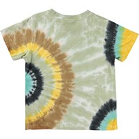 Rame ist ein graues T-Shirt mit bunten Batikspiralen. Das T-Shirt hat einen Rundhalsausschnitt und kurze Ärmel.