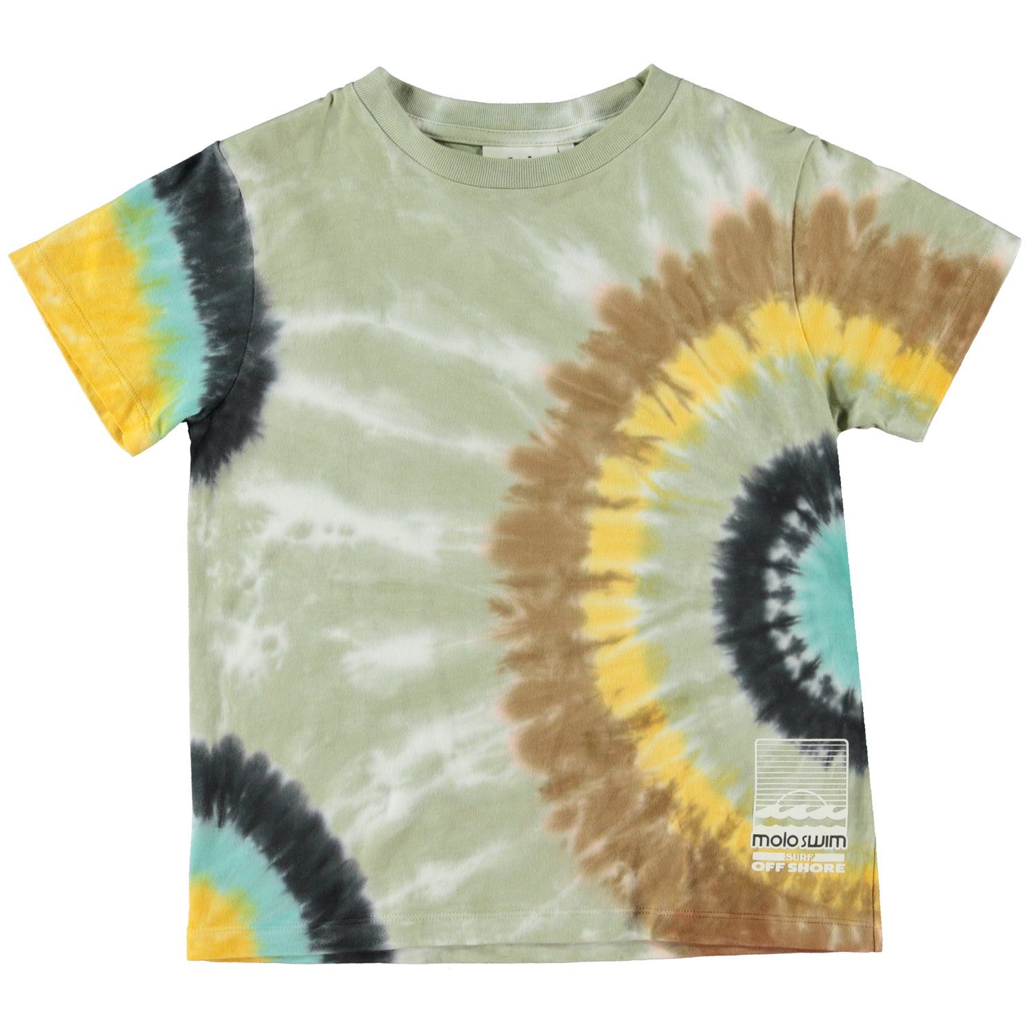 Rame ist ein graues T-Shirt mit bunten Batikspiralen. Das T-Shirt hat einen Rundhalsausschnitt und kurze Ärmel.