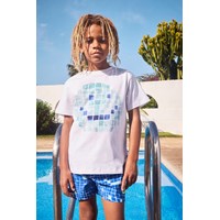 Weißes T-Shirt aus Öko-Baumwolle mit kurzen Ärmeln und geripptem Ausschnitt. Das T-Shirt hat eine lockere Passform und einen Aufdruck eines lächelnden Gesichts in türkisblau.