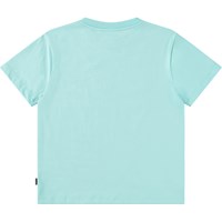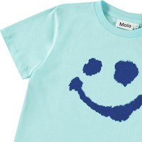 Blaues Öko-Baumwoll-T-Shirt mit kurzen Ärmeln und geripptem Ausschnitt. Das T-Shirt hat eine lockere Passform und ein dunkelblaues lächelndes Gesicht auf der Vorderseite.
