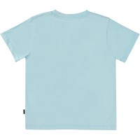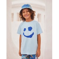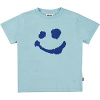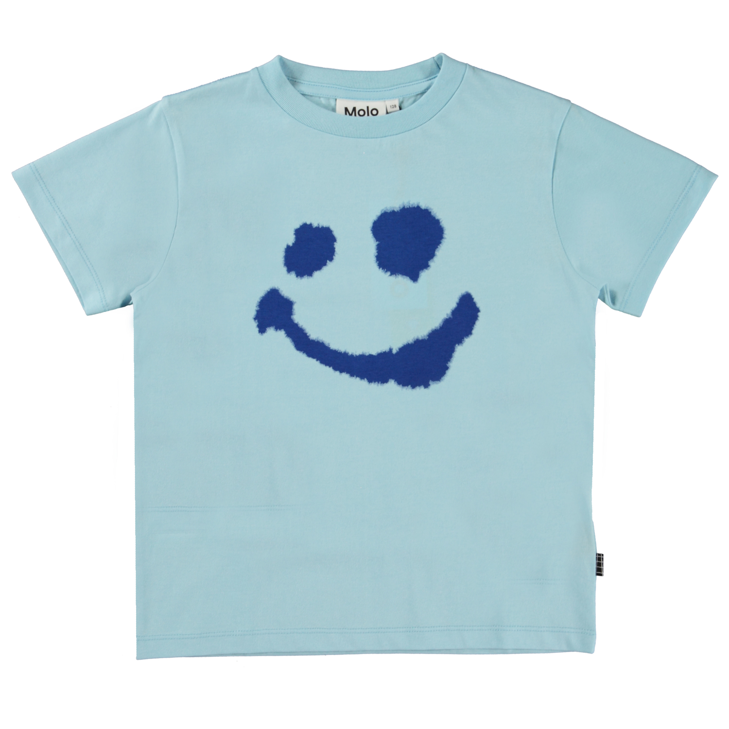Hellblaues T-Shirt mit platziertem Frontprint aus 100% Öko-Baumwolle. Der Druck ist ein blaues lächelndes Gesicht im Aquarell-Look. Das T-Shirt hat einen Rundhalsausschnitt mit geripptem Saum und eine normale Passform.