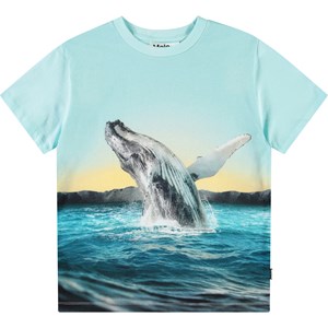 Hellblaues T-Shirt aus weicher Öko-Baumwolle mit geripptem Ausschnitt. Das T-Shirt hat eine lockere Passform mit einem Frontdruck eines blauen Wals, der im weiten offenen Meer springt.