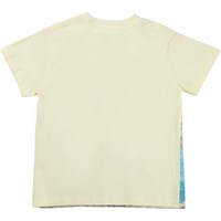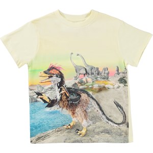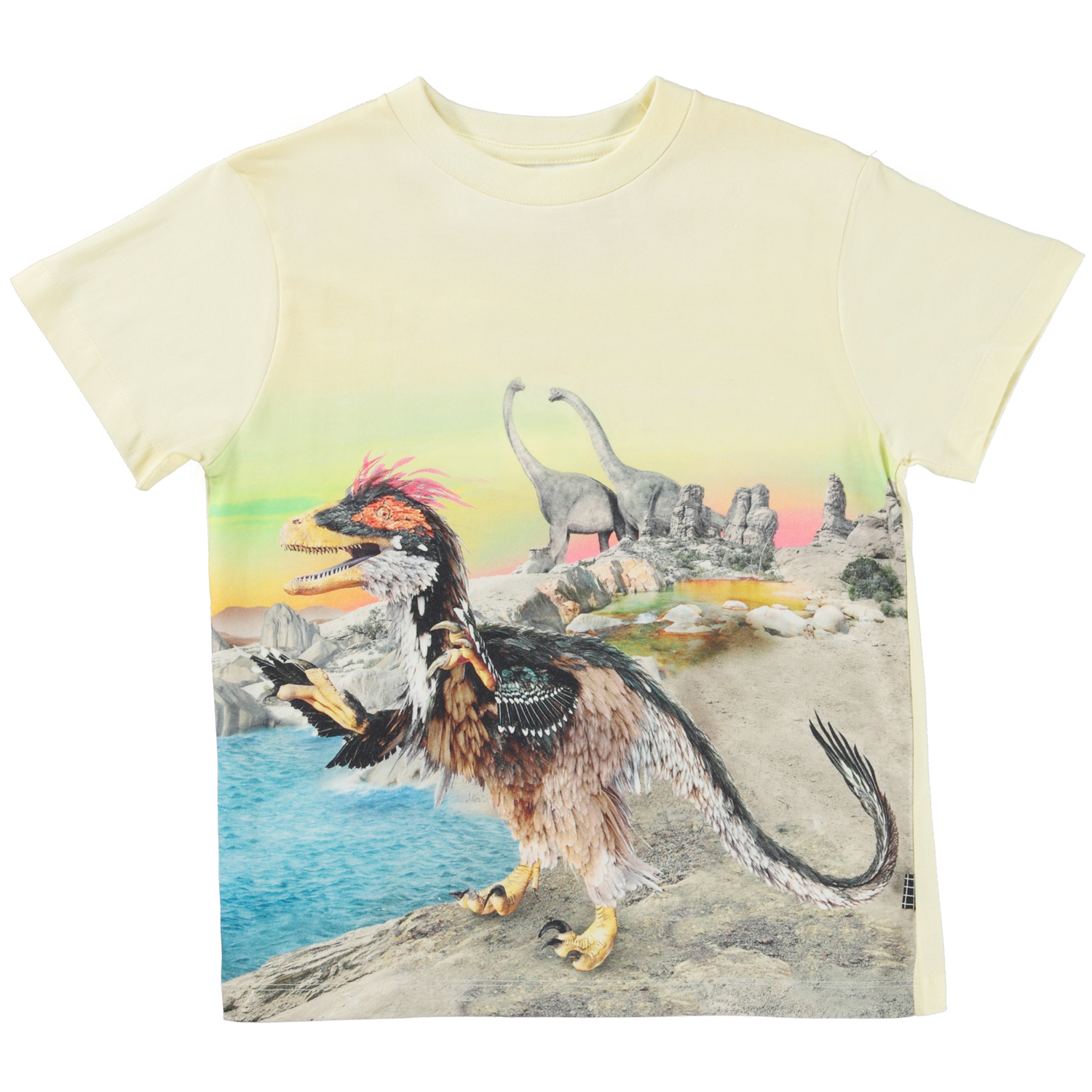 Rame ist ein gelbes T-Shirt aus Öko-Baumwolle mit einem Aufdruck eines gefiederten Dinosauriers auf der Vorderseite. Der Himmel über dem Dinosaurier ist gelb und grün.