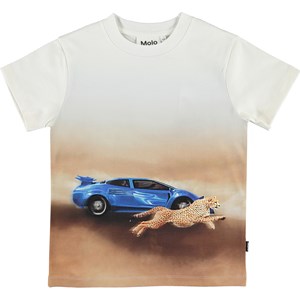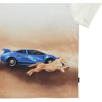 Rame ist ein weißes T-Shirt mit dem Aufdruck "Car Race Cheetah". Wer ist der Schnellste, der Rennwagen oder der Gepard?