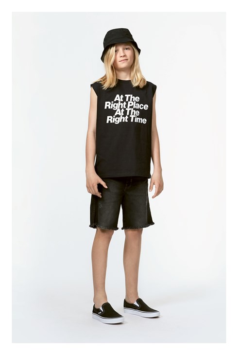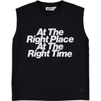 Schwarzes Trägershirt mit weißem Aufdruck auf der Vorderseite.