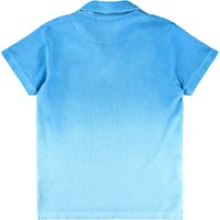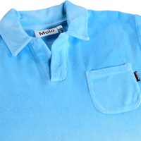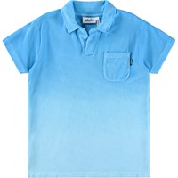 Blaues Polo-T-Shirt aus Bio-Baumwollfrottee mit kurzen Ärmeln und Kragen. Das T-Shirt hat eine lockere Passform, eine Brusttasche und Seitenschlitze.