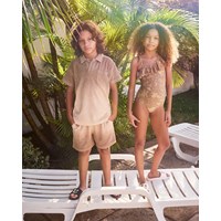 Braunes und beiges T-Shirt aus Öko-Baumwoll-Frottee mit kurzen Ärmeln und Kragen. Das T-Shirt hat eine lockere Passform, eine Brusttasche und seitliche Schlitze. Kombinieren Sie das T-Shirt mit passenden Shorts für ein komplettes Set.