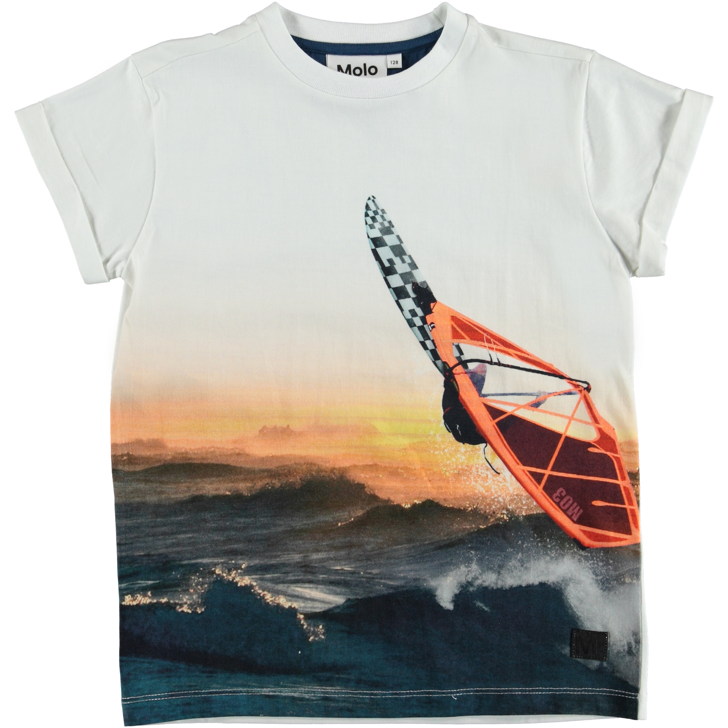 Surf und Sonnenuntergang sind hier auf dem Randon T-Shirt zu sehen. Das T-Shirt besteht aus 100% Baumwolle und hat hochgekrempelte und angenähte Ärmel. Kombiniere Randon mit einer Molo-Badeshorts mit buntem Surf-Print für einen coolen Look.