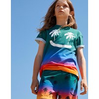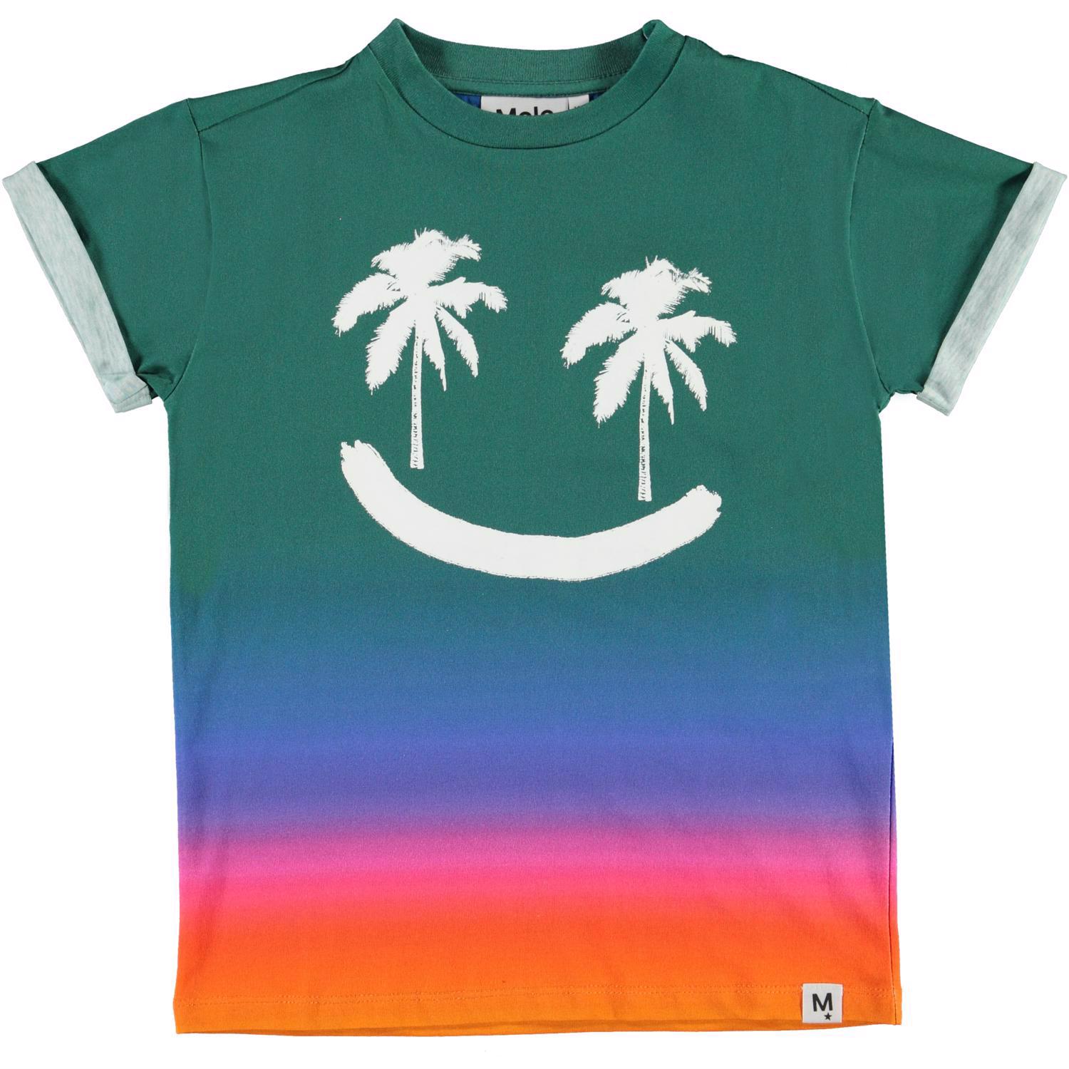 Randon ist ein regenbogenfarbenes T-Shirt mit einem Aufdruck eines weißen Palmen-Smileys und hochgekrempelten Ärmeln. Das T-Shirt ist aus 100% Baumwolle.