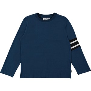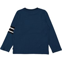 Ras ist eine blauer Langarmpullover mit schwarzen und weißen Streifen auf einem Ärmel.